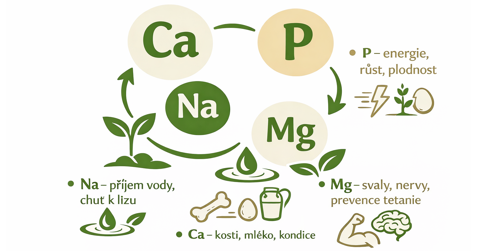 - Ca + P – růst, mléko, kosti, plodnost